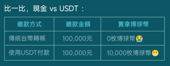 活動內容 🔥 USDT繳款新上線|多10%博球幣超爽拿! 虛擬貨幣付款正式啟動,現在使用 USDT 繳款不只方便還有額外獎勵! 📌 只要你改用 USDT 繳款 📌 就送你額外 10% 博球幣! 為什麼要用 USDT? ✅ 10% 額外獎勵直接送,賺到就是贏 ✅ 匯款不留痕跡,保密性高 限時開放活動,錯過就沒了! 👉新手也會!幣托買 USDT 超簡單 還不會操作?傳訊給客服,我們一步一步教你領到這 10%!